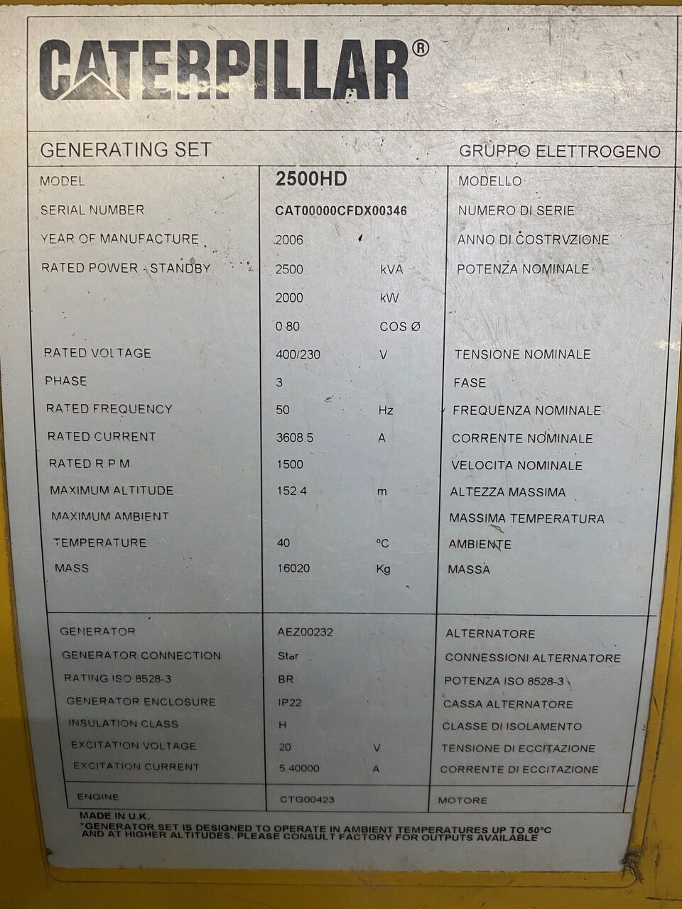 Caterpillar Genset 3516B-HD unused, 2500 kVA stand by , 2000KW , 186 hours only run for servicing the unit